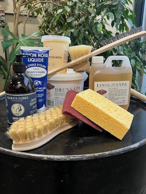Använd Linoljesåpa, Brunsåpa eller varför inte Svartsåpa (som är tillverkad av olivolja). Gör en lätt blandning med ungefär 1/2 dl såpa till 10 l vatten och tvätta med borste eller svamp. En cellulosasvamp håller mycket vatten och gör skurjobbet smidigt. Behövs lite mer tvätt-riv gör Fiberduk Mirlon jobbet! Avsluta med att skölja med rent vatten.
