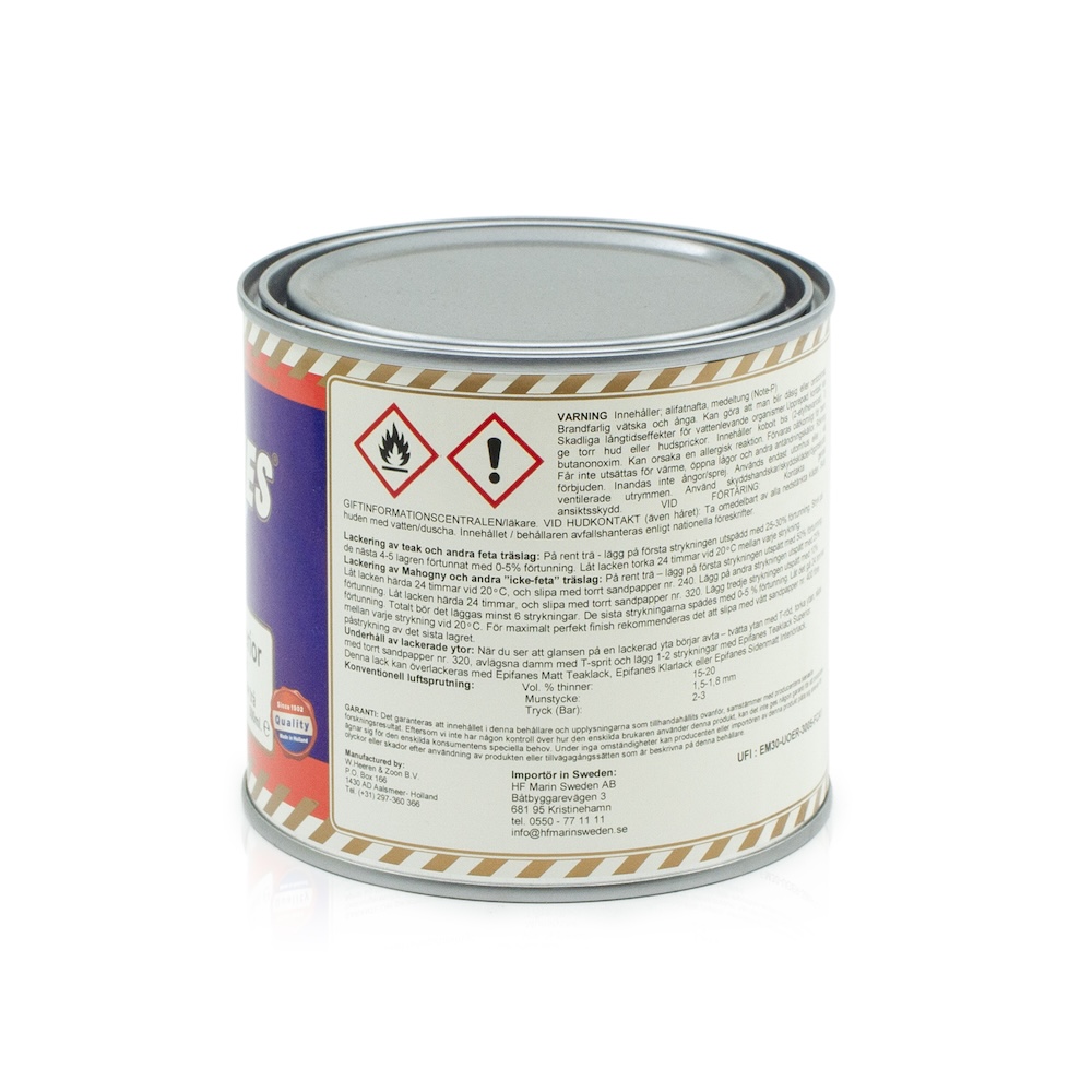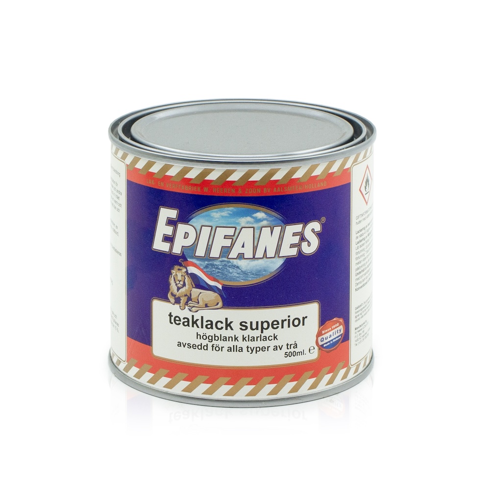Epifanes Teaklack superior ser mjölkvit ut men torkar till en klar, blank och motståndskraftig yta. Förtunnas de första strykningarna med Epifanes penselförtunning eller med lacknafta. Torktid 24 h vid 20°C. 1 L räcker till 12 m2